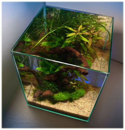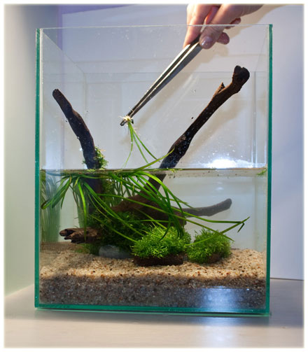 Перш ніж «виконати» або запустити акваріум, нам потрібно підібрати матеріал: рослини, декоративні елементи. Для цього невеликого акваріума я вибрала невибагливі рослини й два види мохів. Так як акваріум має бути швидше декоративним, ніж рибним (об’єм же ж зовсім невеликий – 20л), зовнішньої або внутрішньої активної фільтрації в ньому може й не бути взагалі (достатньо буде донної активності бактерій, або ж сюди можна поставити невеличкий зовнішній фільтр). Внутрішні фільтри для такого акваріума будуть величенькі, але є ще один варіант для таких міні-акваріумів – навісні фільтри-водоспади.