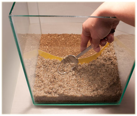 Розрівнюємо поверхню. Я це роблю за допомогою пензлика. В цій композиції планується рівна лінія ґрунту. Нам не потрібні зайві акценти, головну роль у цьому акваріумі будуть грати корчі.
